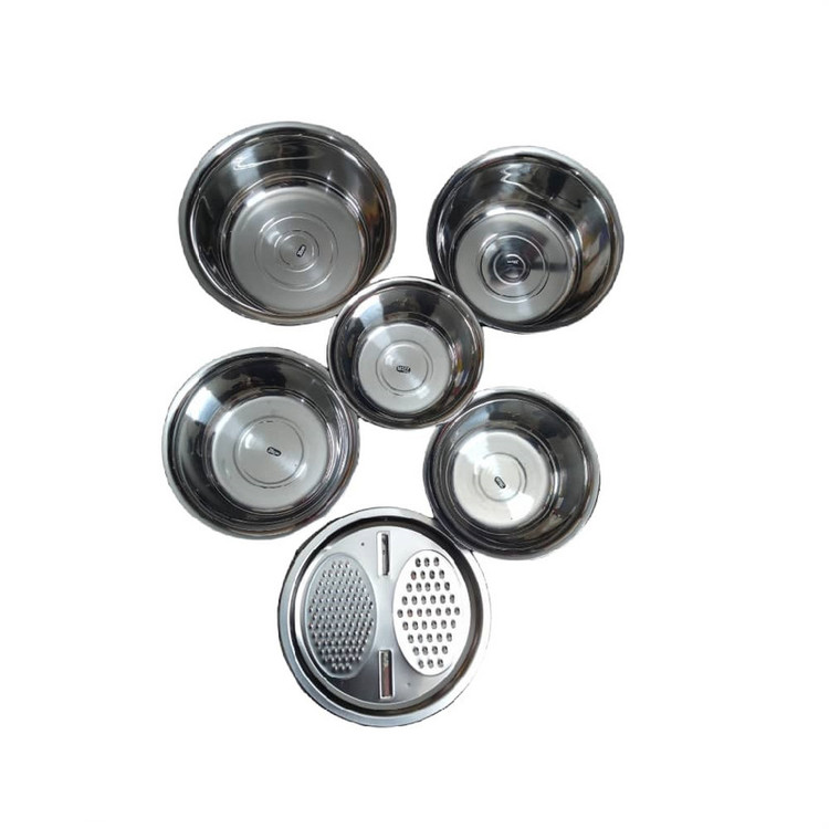این مجموعه شامل 5 عدد لگن استیل میباشد... سایز 1 : 22 سانتی متر سایز 2 : 24 سانتی متر سایز 3 : 26 سانتی متر سایز 4 : 28 سانتی متر سایز 5 : 30 سانتی متر و سایز رنده دو کاره 28 سانتی متر میباشد