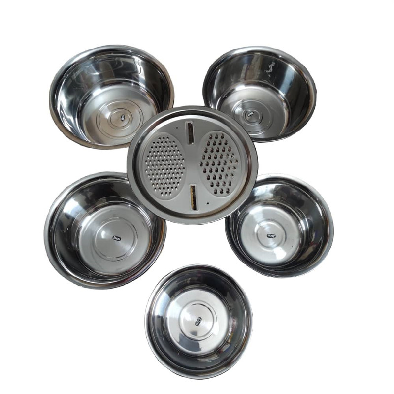 این مجموعه شامل 5 عدد لگن استیل میباشد... سایز 1 : 22 سانتی متر سایز 2 : 24 سانتی متر سایز 3 : 26 سانتی متر سایز 4 : 28 سانتی متر سایز 5 : 30 سانتی متر و سایز رنده دو کاره 28 سانتی متر میباشد