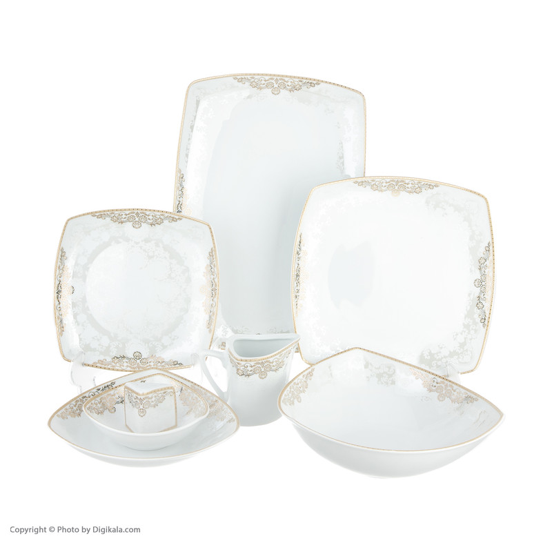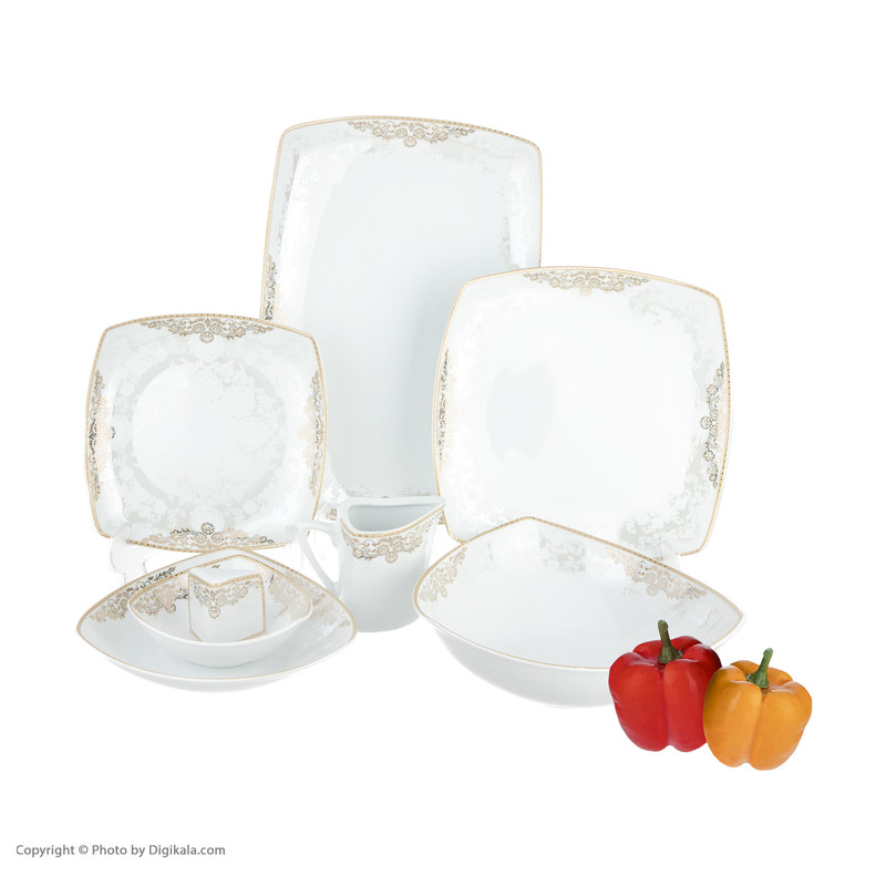 اقلام سرویس : ظرف سالاد , دیس , بشقاب غذاخوری , بشقاب خورشخوری , پیشدستی , نمکپاش و فلفلپاش , پیاله , ظرف سس