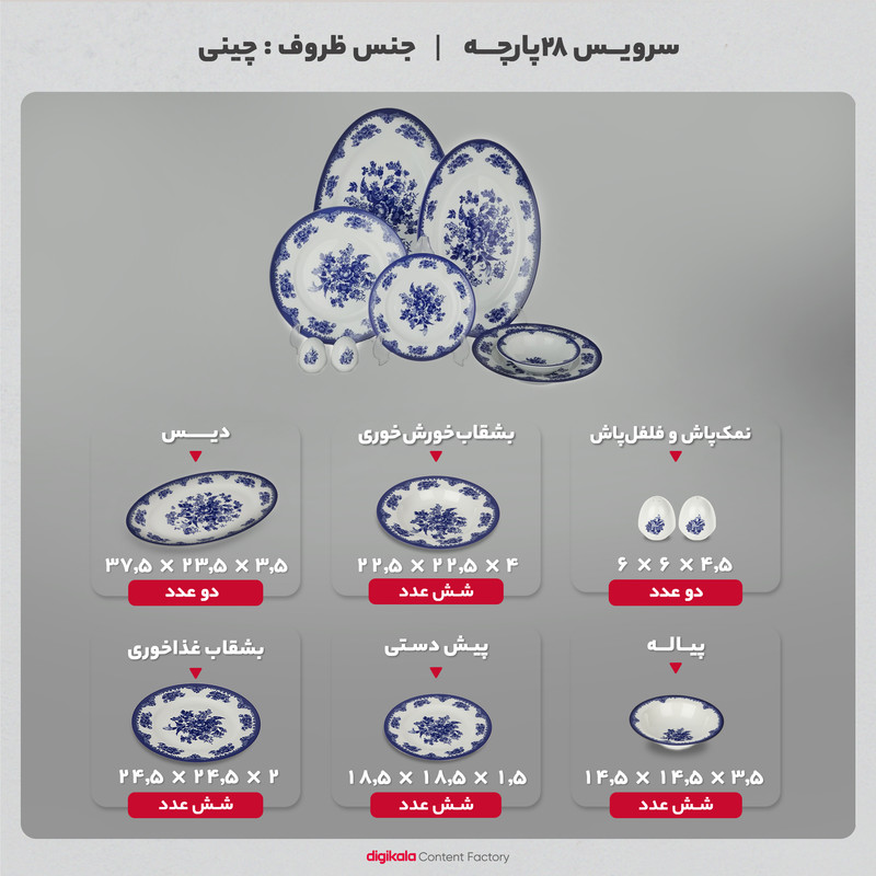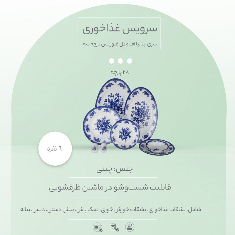 سرویس غذاخوری 28 پارچه چینی زرین ایران سری ایتالیا اف مدل فلورانس درجه سه شامل شش عدد بشقاب غذاخوری و شش عدد بشقاب خورشخوری، دو عدد نمک پاش و فلفلپاش، شش عدد پیش دستی، دو عدد دیس و شش عدد پیاله است. این سرویس با طراحی شیک و زیبا، جلوه و شکوهی خاص به میز شام شما میدهد. این محصول قابل استفاده در مایکروویو است و پس از استفاده هم میتوانید آن را در ماشین ظرفشویی بشویید.