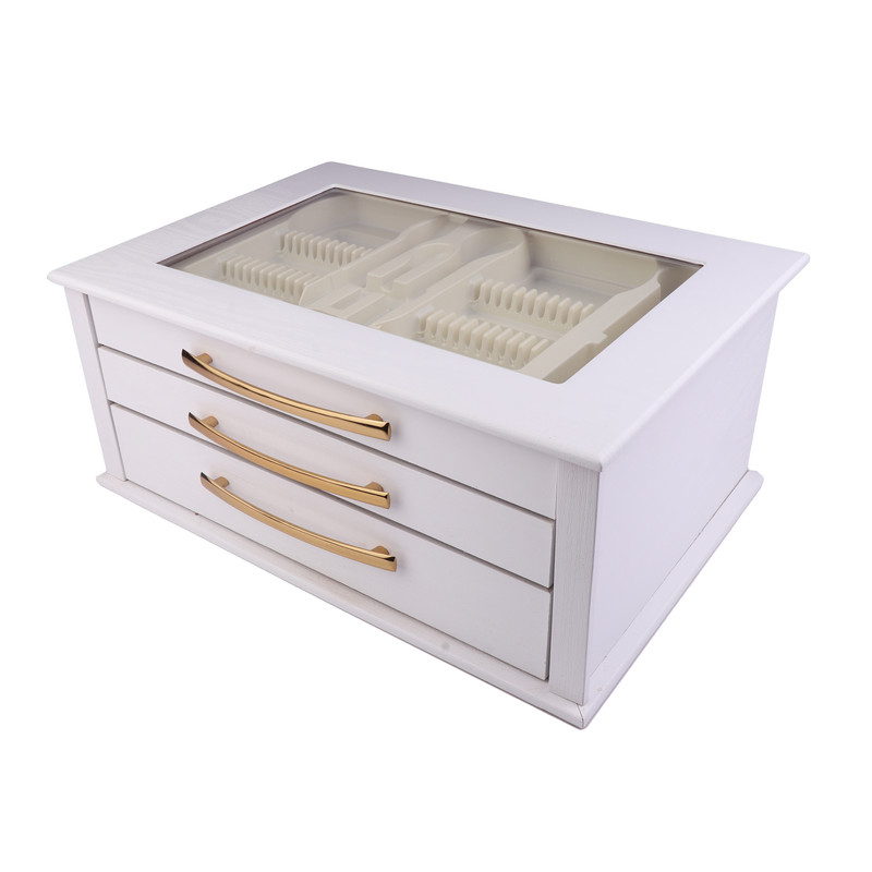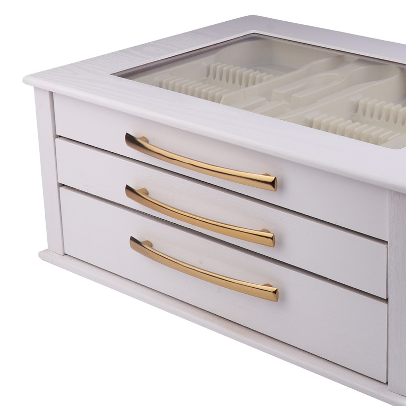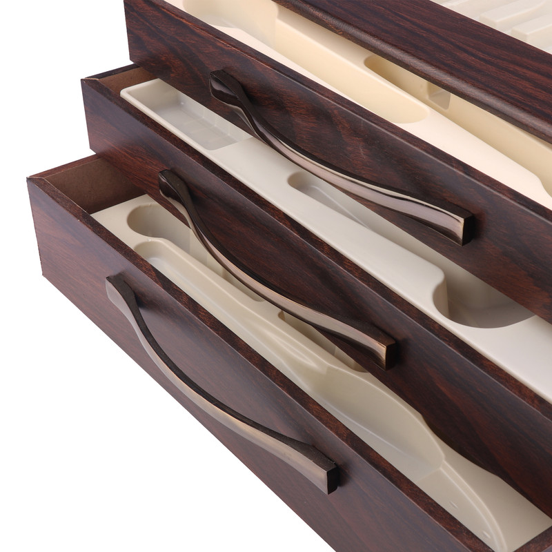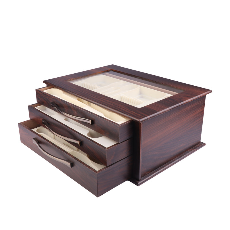 کنسول چوبی قاشق چنگالدالتون به رنگ قهوه ای و سفید سه کشو می باشد.که از بهترین نوع روکش با خطوط الهام گرفته از رده های چوب طبیعی طراحی و ساخته شده است. کیفیت ساخت کنسول چوبی تراز اول کیفی را دارا می باشد و جزو لوکس ترین های بازار کشور می باشد. وجه بالایی کنسول از چوب و شیشه ساخته شده که به زیبایی بیش تر این طراحی افزوده است.کنسول مخصوص چیدمان سرویس قاشق و چنگال برند دالتون یکی از زیباترین و منحصرد بفرد ترین کنسول هایی است که میتوانید برای لوازم خانه خود استفاده کنید. کنسول قاشق و چنگال چوبی دالتون همراه با فوم ارائه میشود. داشتن فوم در کنسول نکته بسیار قابل ملاحضه است که باید در هنگام خرید به آن توجه شود.