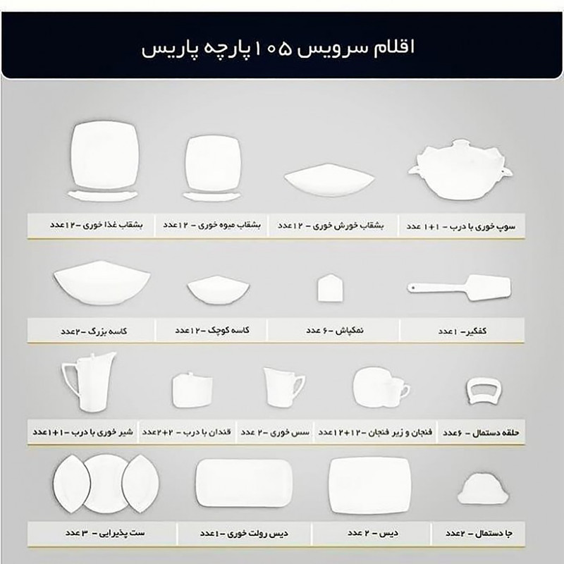 سرویس غذاخوری 105 پارچه چینی پردیس کاشان سری پاریس مدل هیرام 456 B