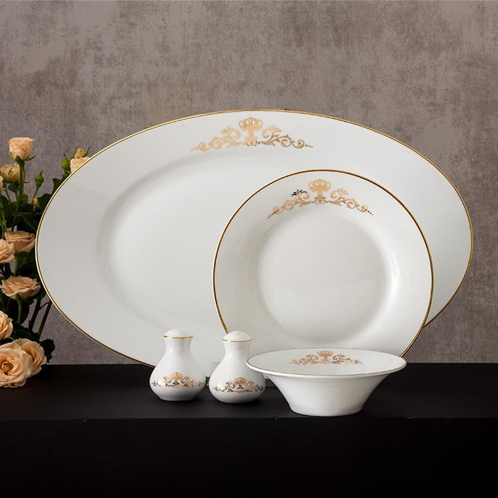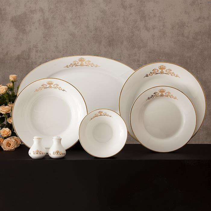 تعداد کلی ظروف35 پارچهاقلام سرویسسوپخوری , ظرف سالاد , دیس , بشقاب غذاخوری , بشقاب خورشخوری , پیشدستی , نمکپاش و فلفلپاش , پیالهجنس ظروفچینیمناسب برای6 نفررنگطلایی