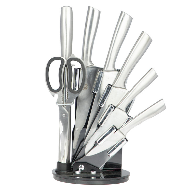 4 عدد کارد در سایز های مختلف 1 عدد ساطور 1 عدد قیچی آشپزی 1 عدد چاقو تیز کن 1 عدد استند جنس کارد از استیل بوده و ضد زنگ می باشد خوش دست و طراحی زیبا