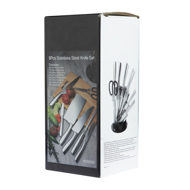 4 عدد کارد در سایز های مختلف 1 عدد ساطور 1 عدد قیچی آشپزی 1 عدد چاقو تیز کن 1 عدد استند جنس کارد از استیل بوده و ضد زنگ می باشد خوش دست و طراحی زیبا
