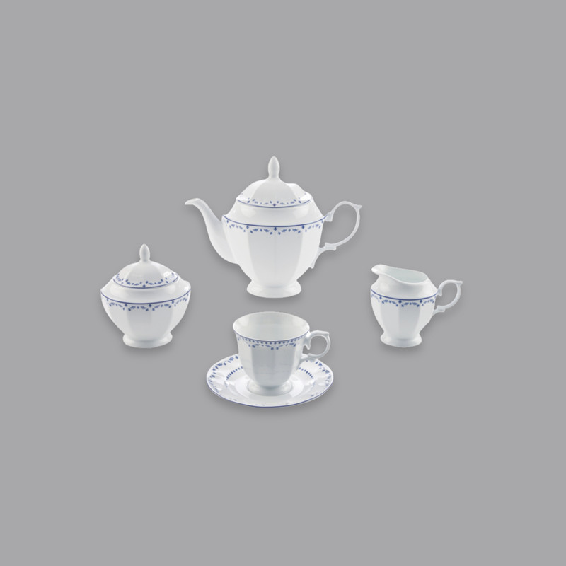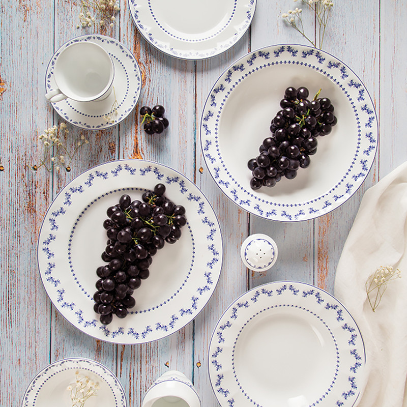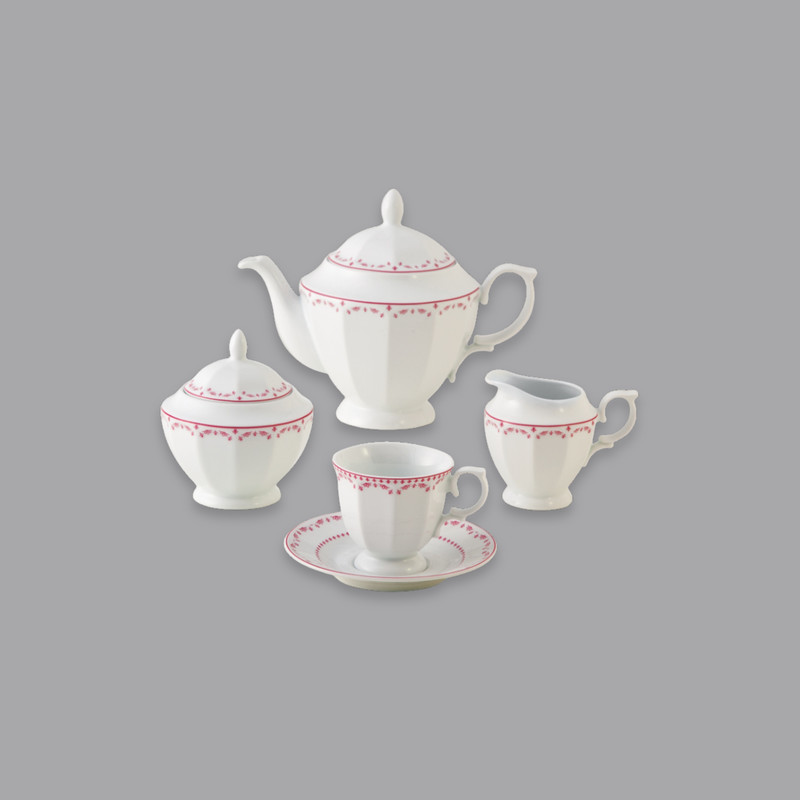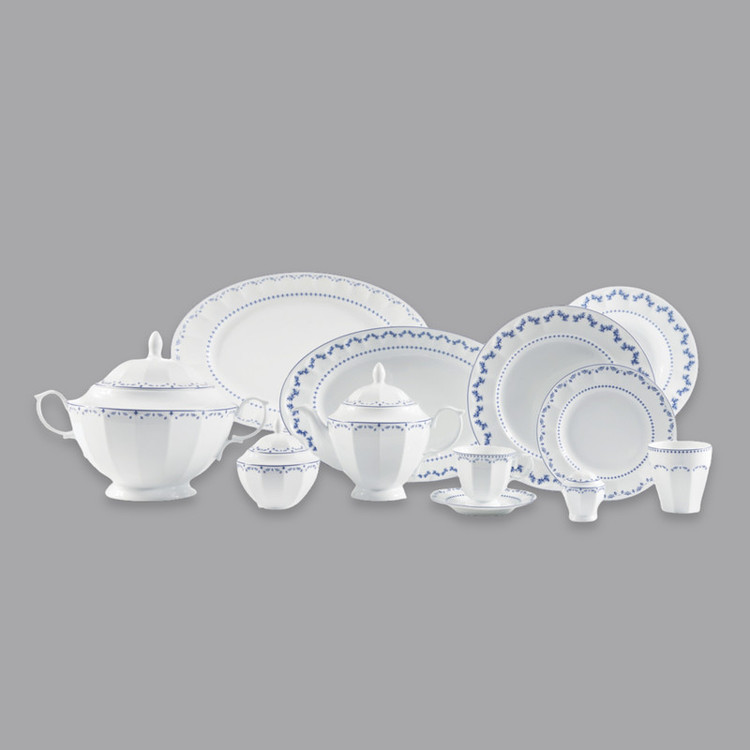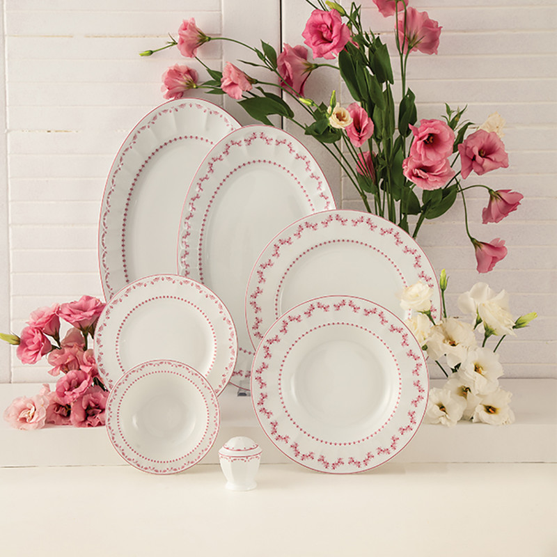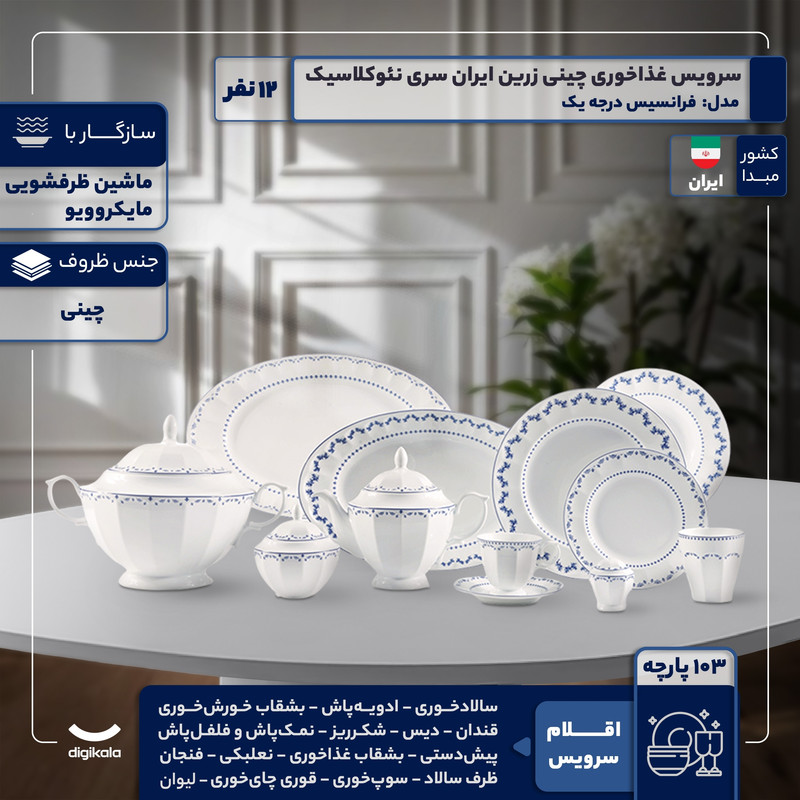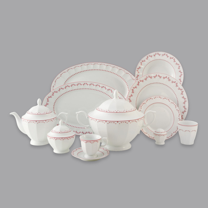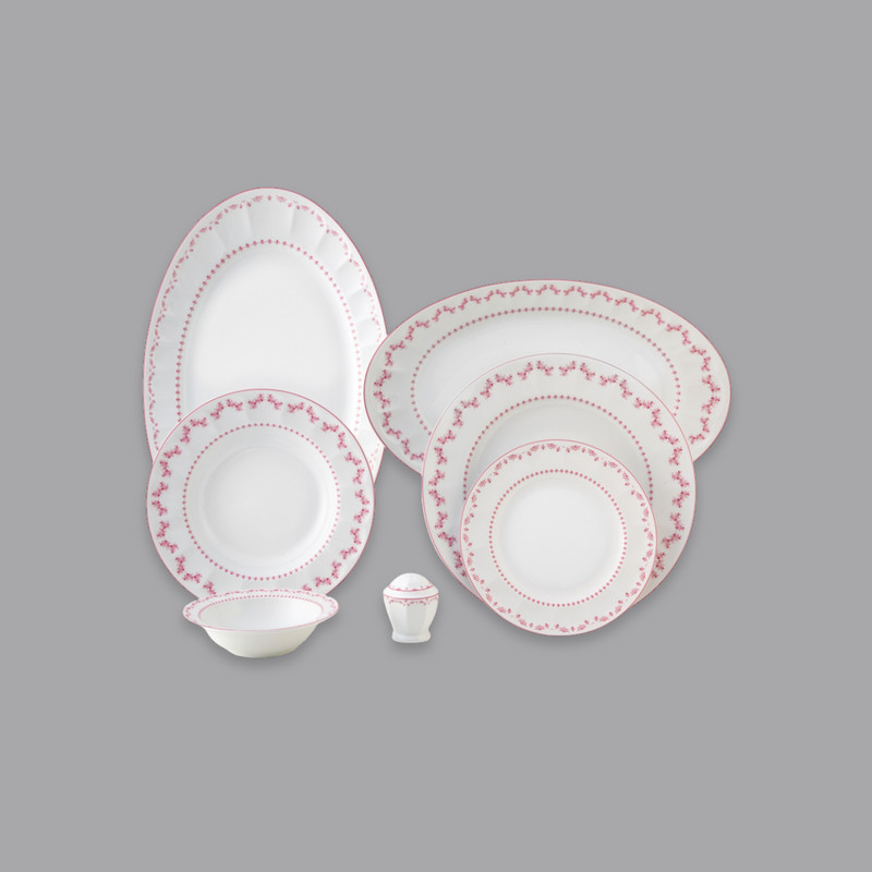سوپخوری , ظرف سالاد , دیس , بشقاب غذاخوری , بشقاب خورشخوری , پیشدستی , قوری چایخوری , فنجان , نعلبکی , قندان , شکرریز , نمکپاش و فلفلپاش , لیوان , سالادخوری , ادویهپاش