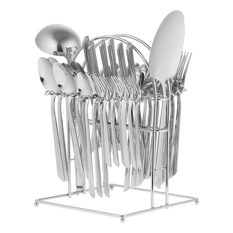 شامل 6 عدد قاشق غذا خوری 6 عدد چنگال غذا خوری 6 عدد قاشق مربا خوری 6 عدد کارد میوه 6 عدد چنگال میوه 6 عدد قاشق شربت خوری 1 عدد کفگیر 1 عدد ملاقه یک استند