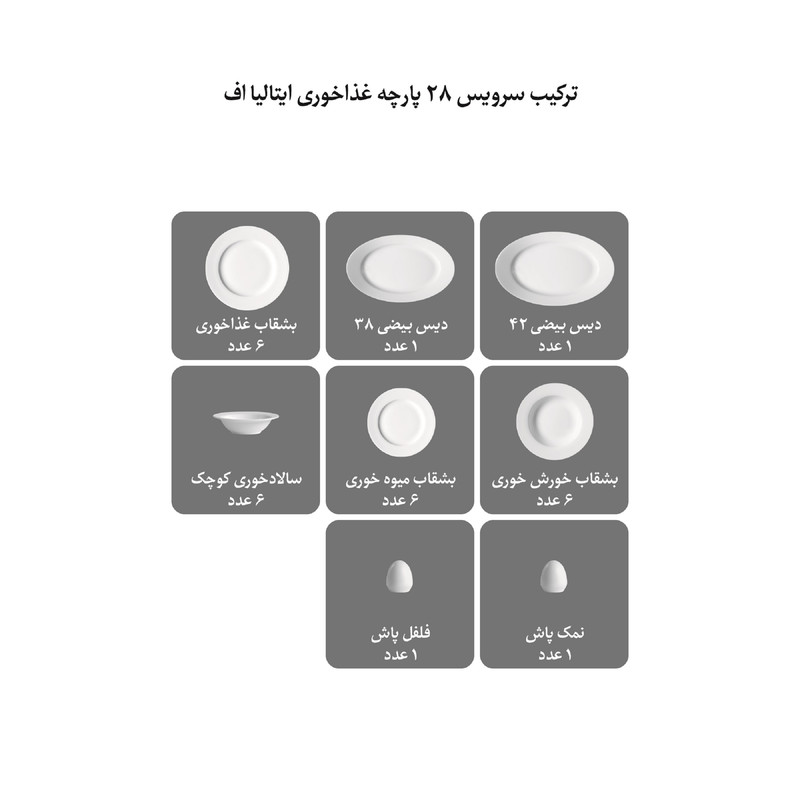 ظروف چینی ایتالیا اف با زیبایی کلاسیک و طراحی موزون خود، در اولین نگاه نظر هر بیننده ای را جلب می نماید. قطعات فوق العاده ظریف این پیکره به نحوی طراحی شده اند که از هر جهت پاسخگوی نیازهای مصرف کنندگان باشند. طرح نشات گرفته از خطوط منحنی ملایم در کنار کیفیت بسیار بالای بدنه چینی این ظروف، تکمیل کننده جذابیت ایتالیا اف است.
