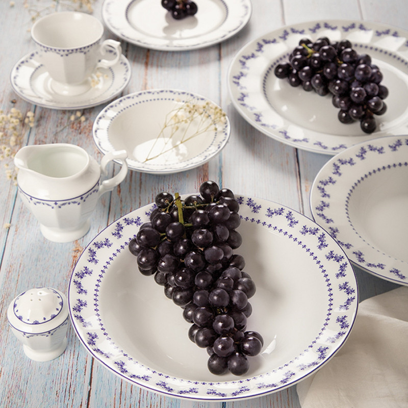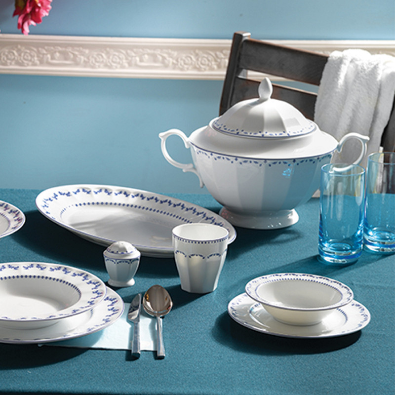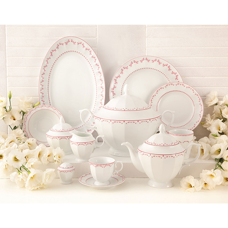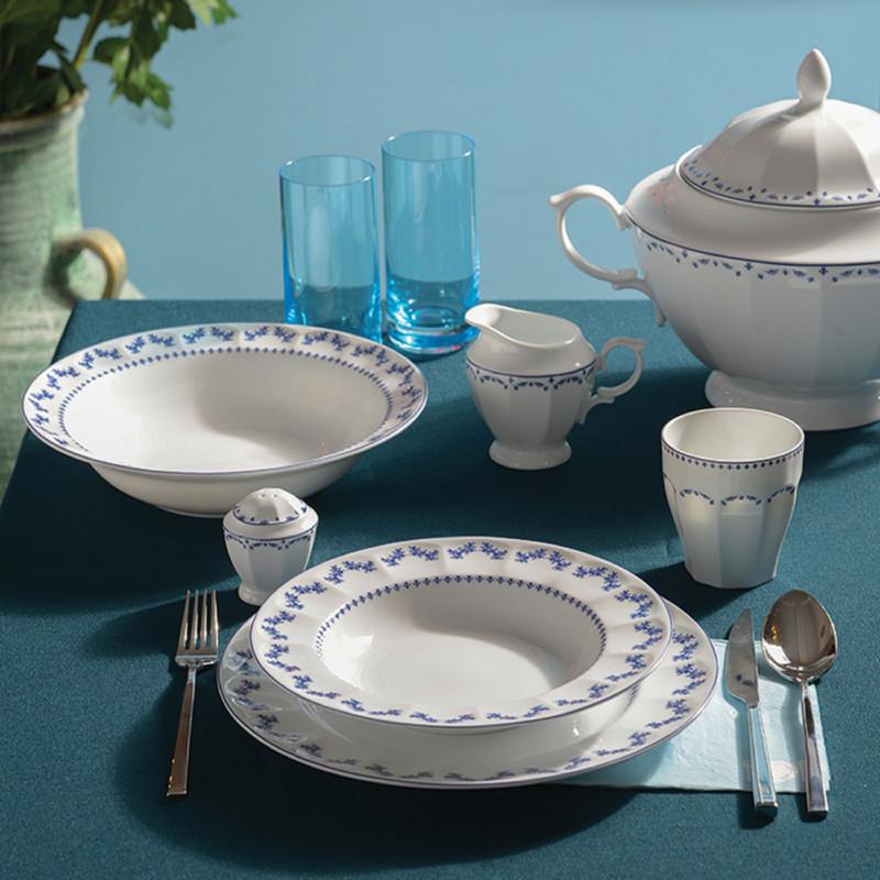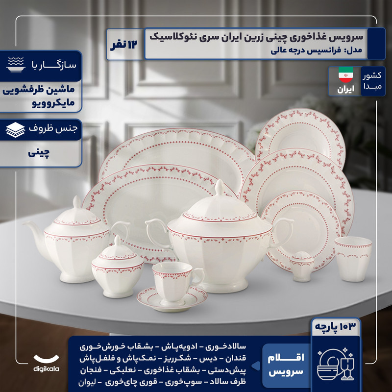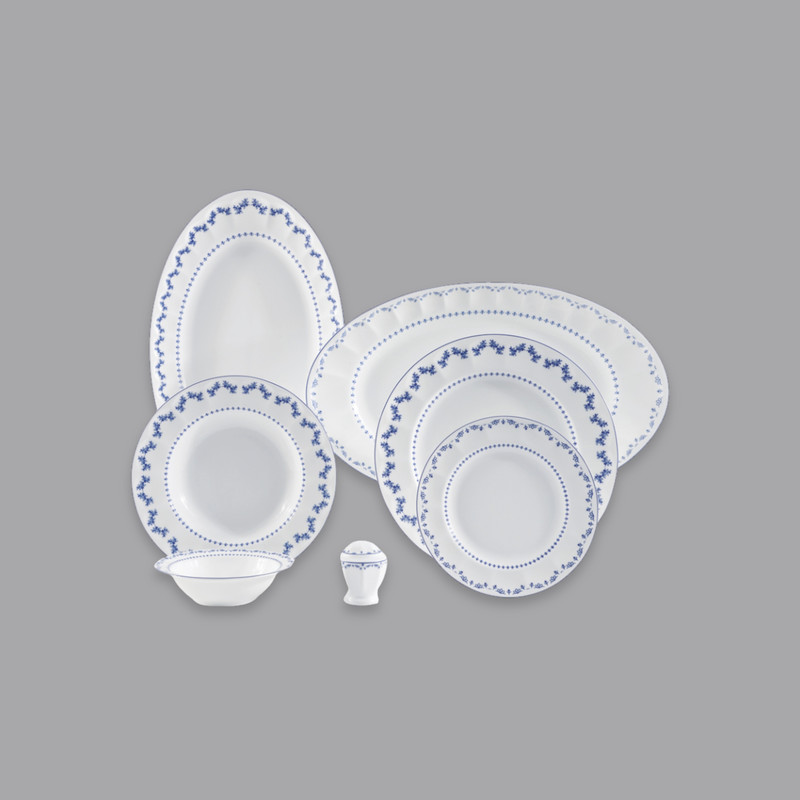 سوپخوری , ظرف سالاد , دیس , بشقاب غذاخوری , بشقاب خورشخوری , پیشدستی , قوری چایخوری , فنجان , نعلبکی , قندان , شکرریز , نمکپاش و فلفلپاش , لیوان , سالادخوری , ادویهپاش