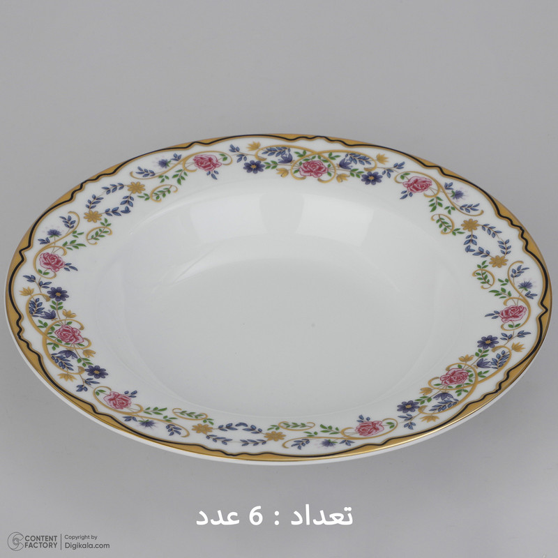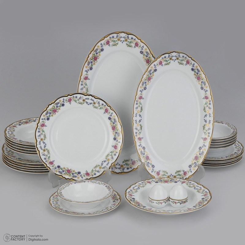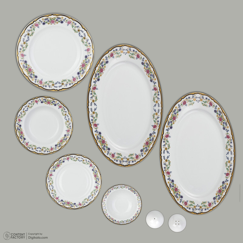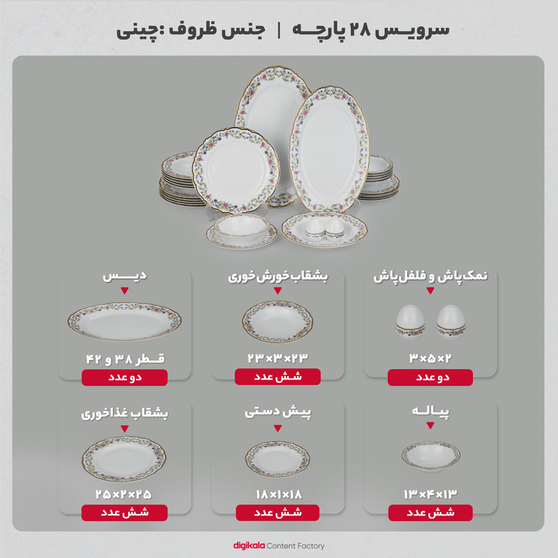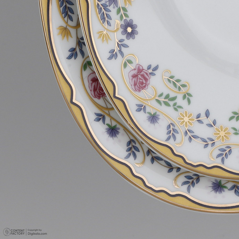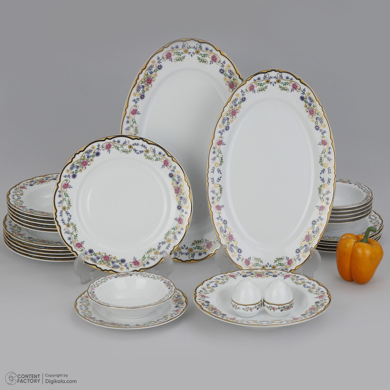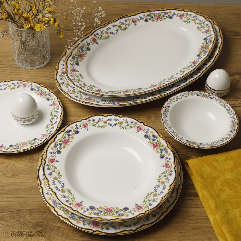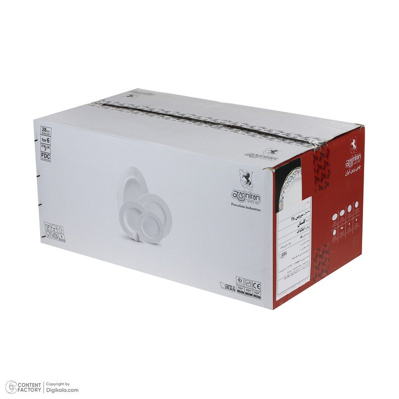 سرویس چینی 28 پارچه غذاخوری چینی زرین ایران سری ایتالیا اف مدل گلستان درجه یک، مناسب برای پذیرایی از شش نفر در یک وعدهی غذایی است. ظروف این سرویس شامل یک دست بشقاب غذاخوری، یک دست خورشخوری، یک دست پیشدستی، یک دست پیاله، دو عدد نمکپاش و دو دیس است. یکی از ویژگیهای این سرویس چینی این است که بیشتر اجزای آن لعابزنی شدهاند و بعد از رنگآمیزی، لعابزنی انجام میشود. این کار باعث میشود دوام طرح و رنگ ظروف تا حد زیادی بالا برود و شرکت چینی زرین ایران هم کیفیت و دوام این طرحها را به صورت مادامالعمر تضمین کند. یک ویژگی دیگر این محصولات این است که میتوانید آنها را برای شستشو در ماشین ظرفشویی استفاده کنید. در تزیین این ظروف از طلای سفید (پلاتین) استفاده شده است که زیبایی و شکوه بیشتری به آنها میبخشد. به طور کلی، این سرویس چینی با کیفیت و ظاهر زیبا، گزینهی عالی برای سفرهی شما خواهد بود. این سرویس شامل شش عدد بشقاب غذاخوری، شش عدد بشقاب خورشخوری ، شش عدد پیشدستی و دو عدد نمکپاش و فلفلپاش با ظرفیت 55 سی سی است. این ظروف دارای شکل دایره هستند و ساخت ایران هستند. این سرویس چینی قابل استفاده در مایکروویو و همچنین قابل شستشو در ماشین ظرفشویی است. این مجموعه ظروف زیبا و کاربردی، انتخاب عالی برای سفرهی شما خواهد بود.